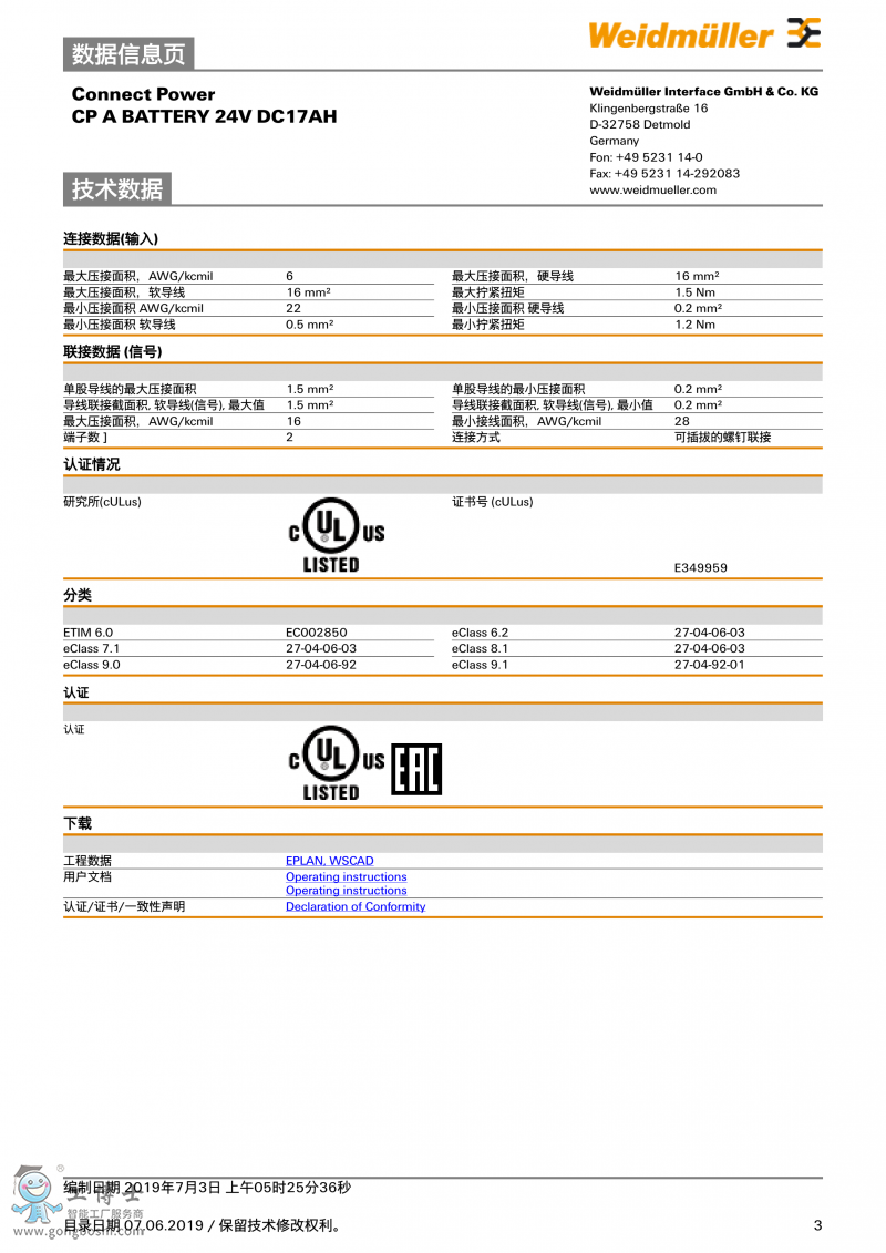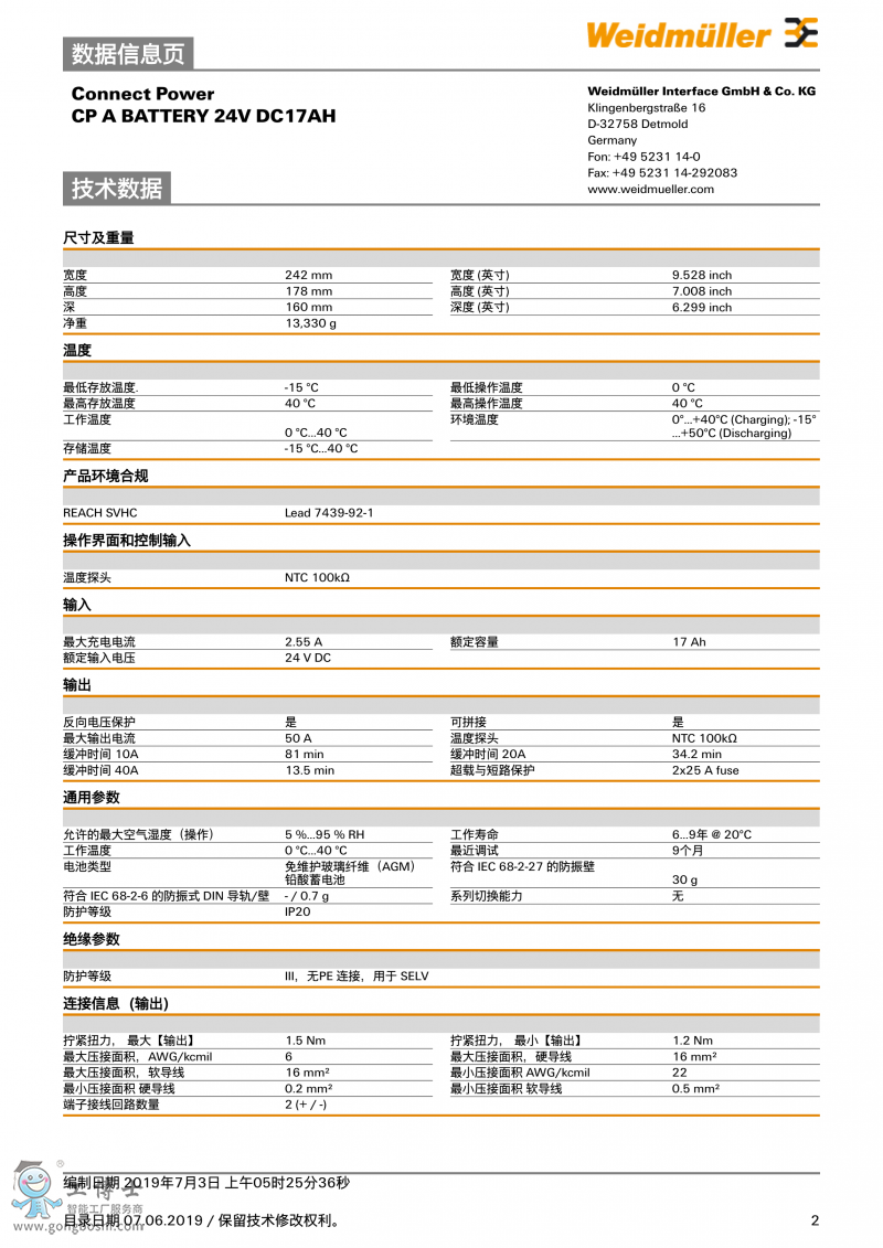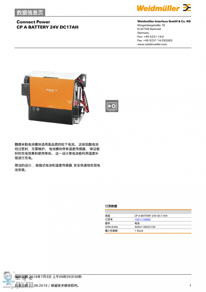 CP A BATTERY 24V DC17AH魏德米勒 UPS電池 訂貨號1251110000 |