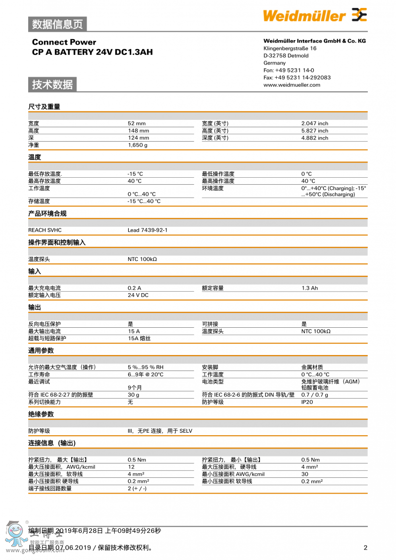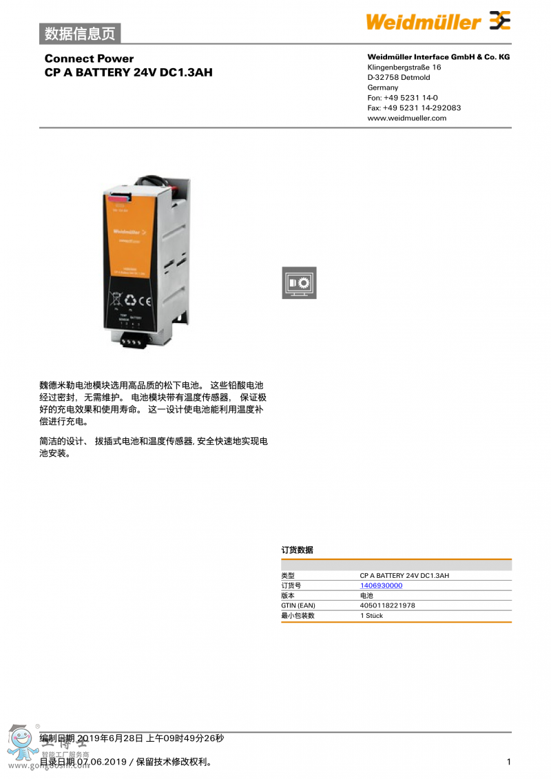 CP A BATTERY 24V DC1.3AH魏德米勒 UPS電池 訂貨號(hào)1406930000 |