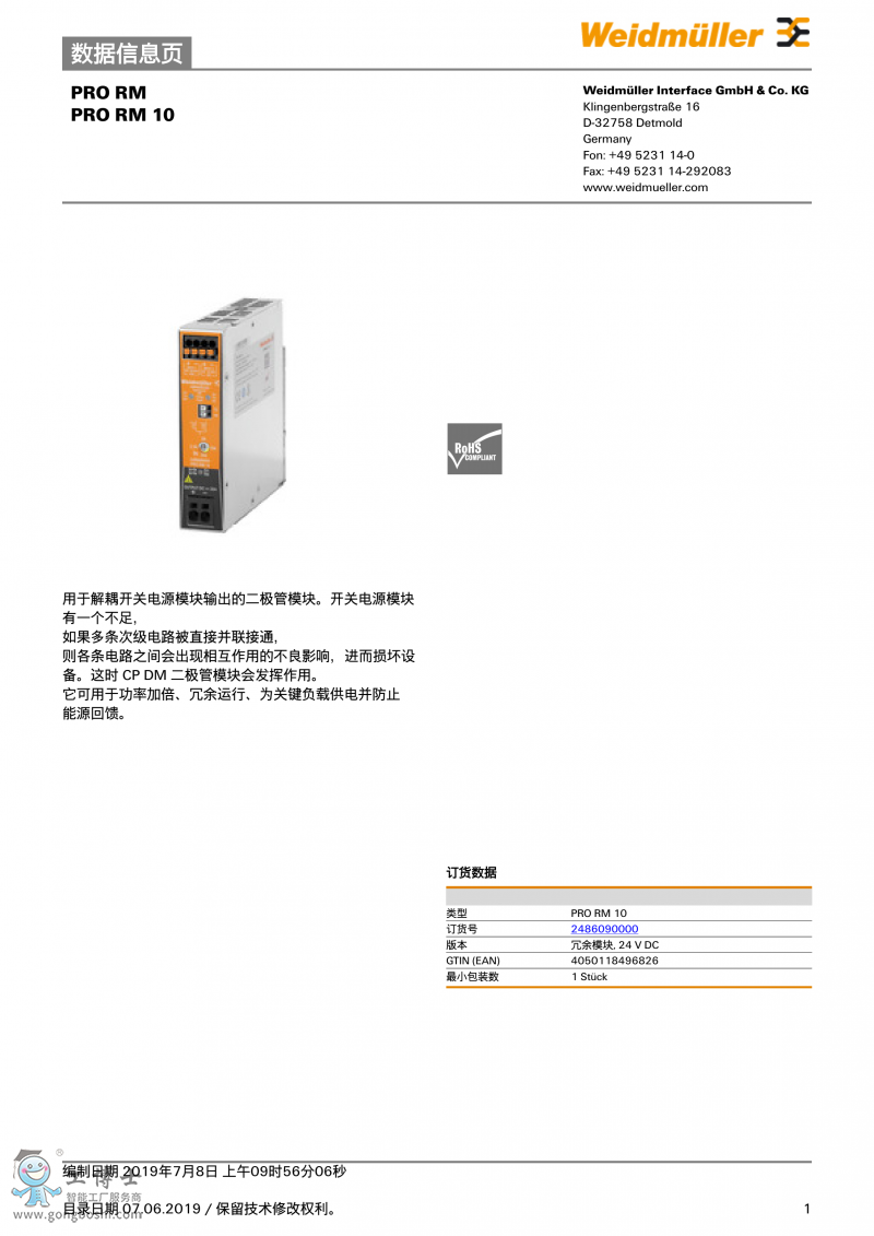 PRO RM 10魏德米勒weidmuller 冗余模塊 訂貨號2486090000 |