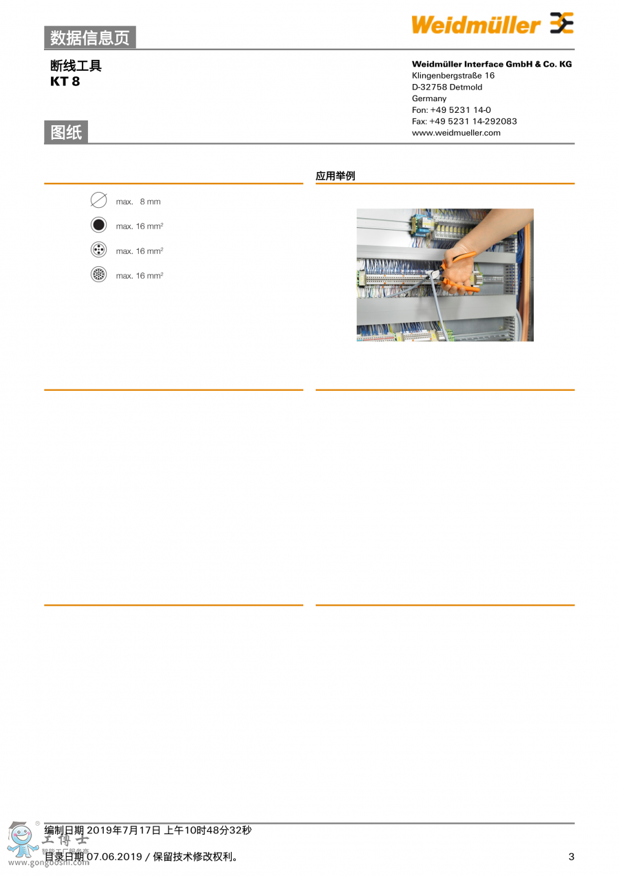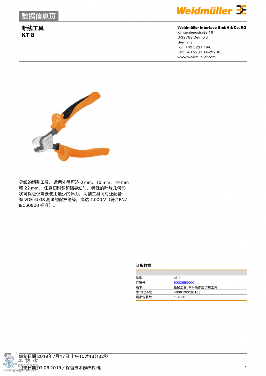 KT 8 魏德米勒weidmulle 單手操作式切割工具 訂貨號(hào)9002650000 |