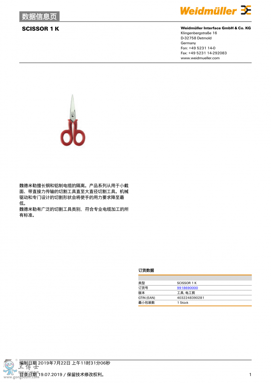 SCISSOR 1 K 魏德米勒weidmulle 電工剪 訂貨號(hào)9918690000 |