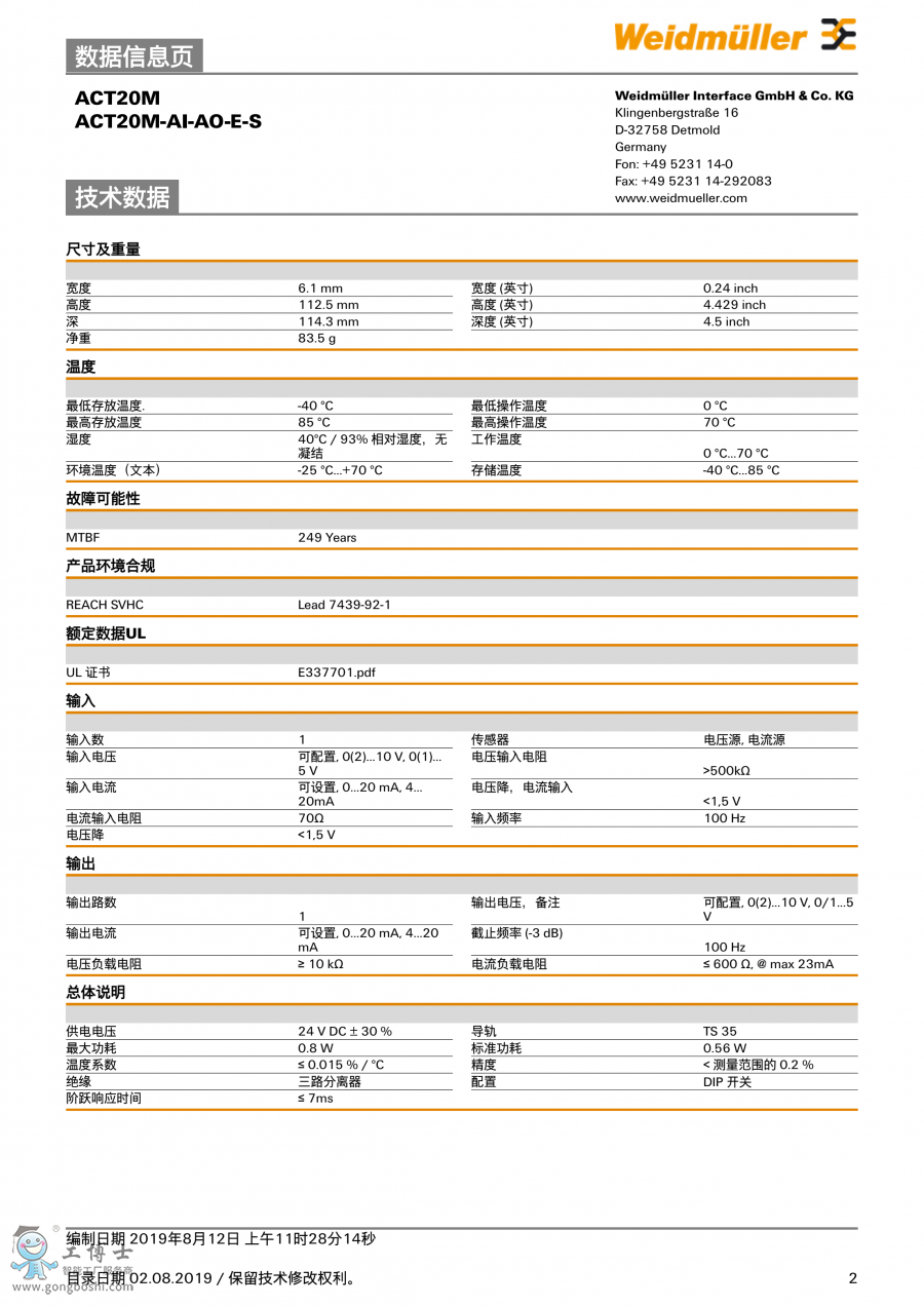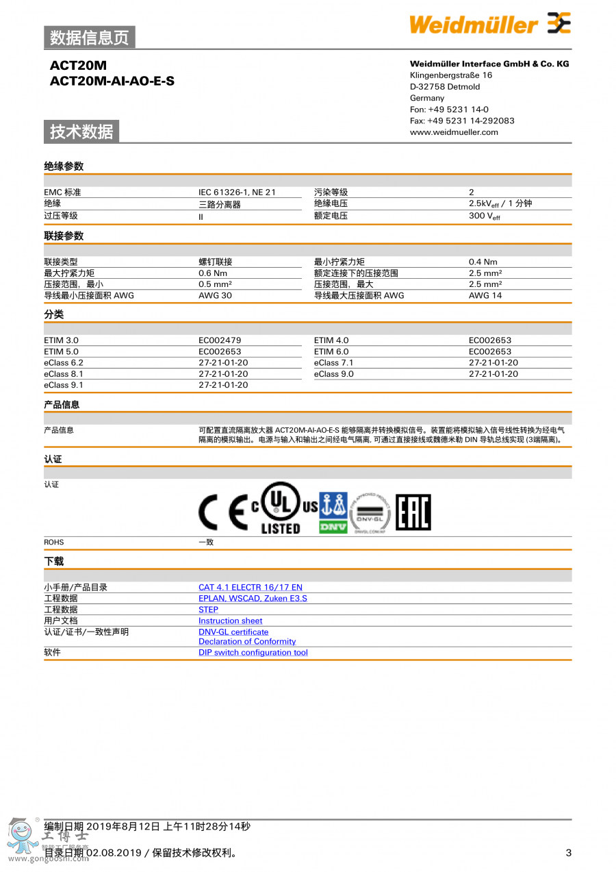 ACT20M-AI-AO-E-S魏德米勒weidmuller信號變送器 訂貨號1176010000 |