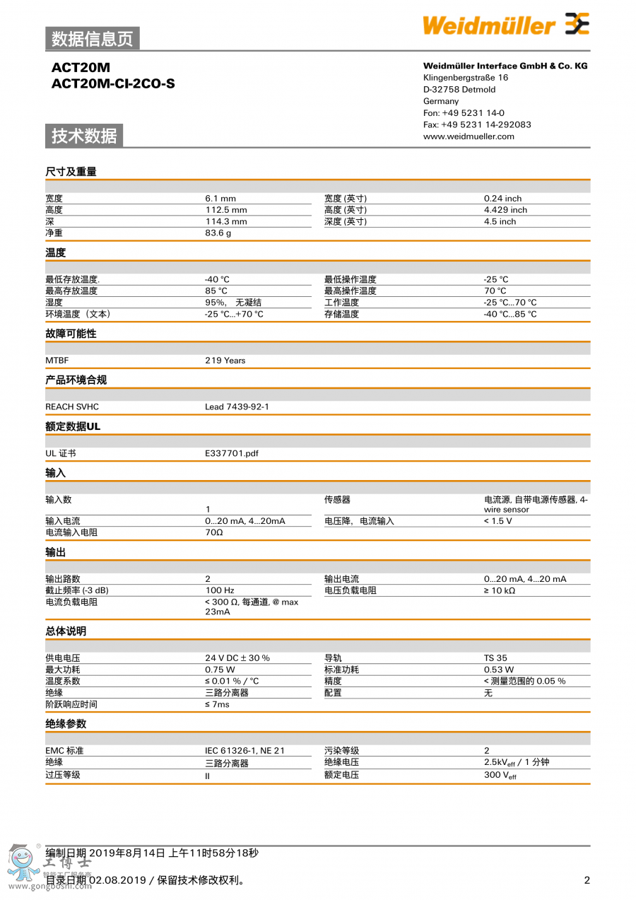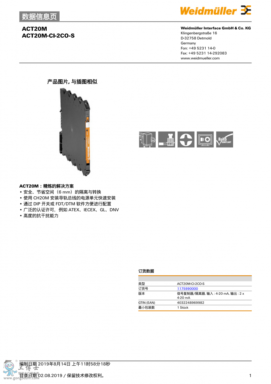 ACT20M-CI-2CO-S 魏德米勒weidmueller信號分配器 訂貨號117599000 |