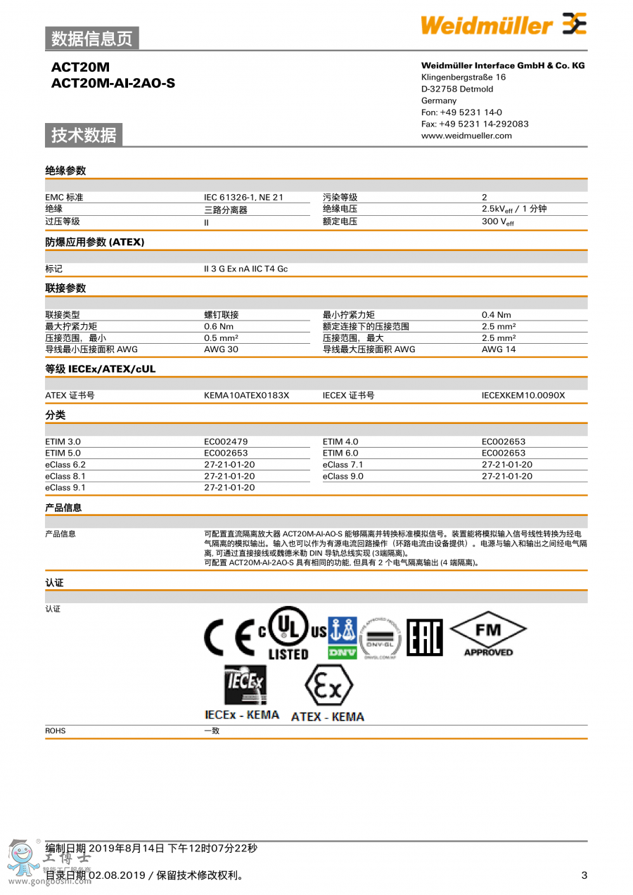 ACT20M-AI-2AO-S 魏德米勒weidmulle 信號分配器 訂貨號1176020000 |