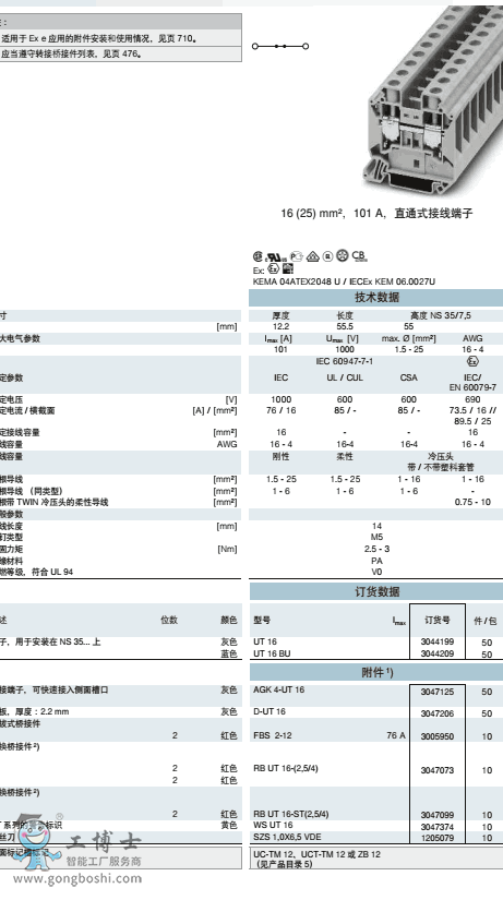 菲尼克斯phoenix螺釘接線UT 16 BU訂貨號3044209原裝現貨 可開增票