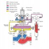 先導(dǎo)總成與電機閥桿總成(交叉)是調(diào)節(jié)器中**的運動單元。這個先導(dǎo)插頭由兩個硬連接的不銹鋼球組成。在一起。先導(dǎo)塞的上座是馬達閥。隔膜壓力入口(紫羅蘭至黃色)。較低的座位引水塞是壓力通風(fēng)口(黃色到大氣)。先導(dǎo)供給壓力(Violet)引導(dǎo)馬達閥。膜片為電機閥提供關(guān)閉力逆流而上的壓力。閥蓋中的先導(dǎo)彈簧加載領(lǐng)航組件,并在下游的下方與之相對。壓力(藍色)在波紋管大會。假設(shè)先導(dǎo)彈簧用調(diào)整螺絲壓縮的設(shè)定壓力大于下游壓力(藍色)波紋管大會。試點大會被迫向下在導(dǎo)航儀彈簧旁邊。飛行員的下座插頭(黃色到大氣)關(guān)閉,上面的閥座先導(dǎo)插頭(紫羅蘭到黃色)是打開的。這允許飛行員提供壓力(紫羅蘭),以加載底部的馬達閥隔膜以平衡頂部壓力側(cè)面。上游壓力(紅色)作用于馬達閥下閥座打開閥門。當(dāng)下游壓力(藍色)上升到設(shè)定壓力時,波紋管大會向上膨脹,壓縮先導(dǎo)彈簧和**次關(guān)閉上座(紫羅蘭至然后打開壓力通風(fēng)口(黃色到大氣層)。電機閥隔膜壓力(黃色)降低,先導(dǎo)供給壓力作用于馬達閥膜片頂部開始關(guān)閉閥門。隨著下游壓力(藍色)上升到設(shè)定壓力,飛行員大會采取兩個席位的位置。引線插頭都關(guān)閉了。間歇放血引流閥,三通閥的動作先導(dǎo)插頭靠在閥座上調(diào)整馬達閥,閥桿總成可容納任何流量。急促但穩(wěn)定的重新定位會產(chǎn)生真正的節(jié)流動作。