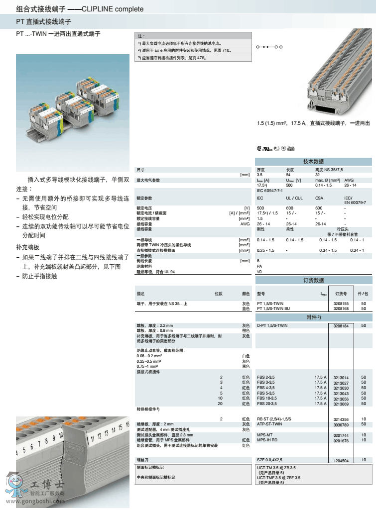 菲尼克斯phoenix直插式接線PT 1,5/S-TWIN訂貨號(hào)3208155原裝現(xiàn)貨 可開增票