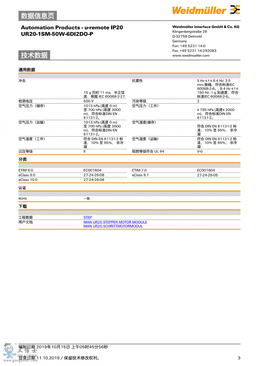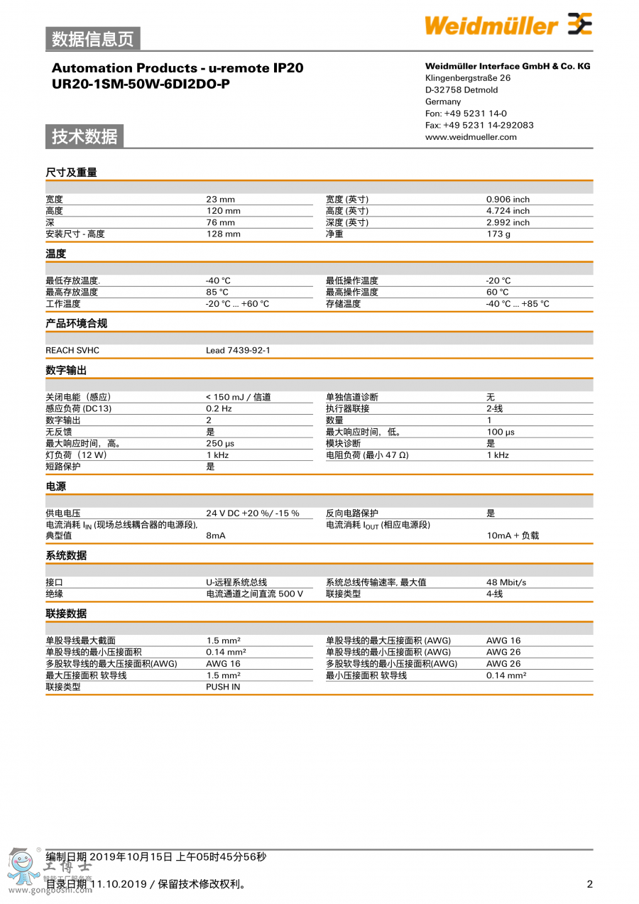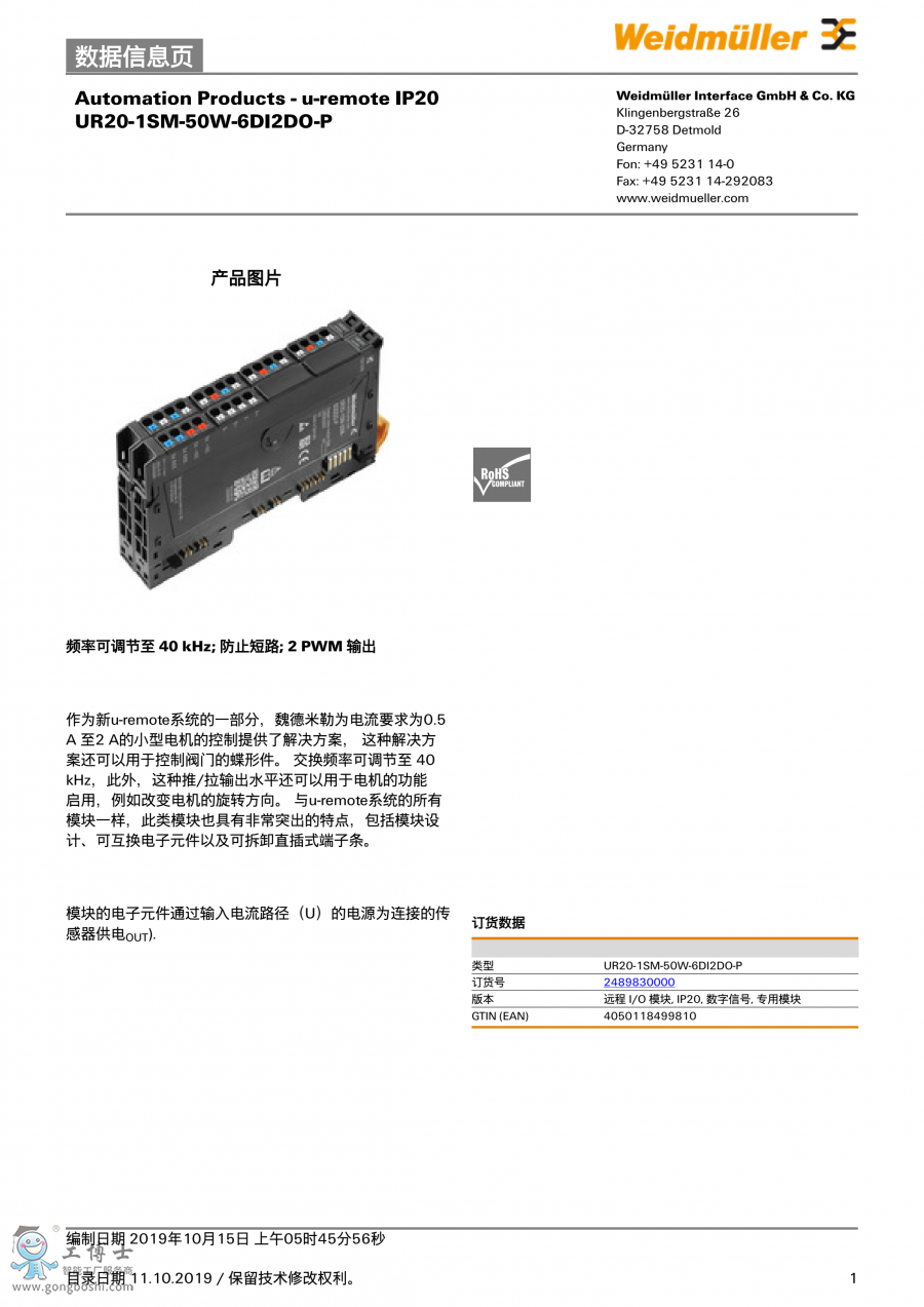 UR20-1SM-50W-6DI2DO-P 魏德米勒 遠程I/O模塊 訂貨號2489830000 |