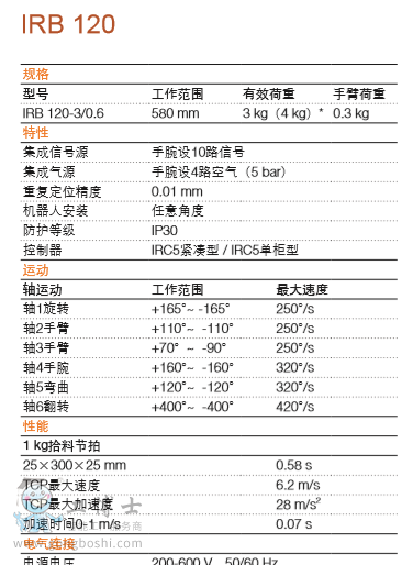ABB迄今極小的多用途機器人IRB 120僅重25kg,荷重3kg(垂直腕為4kg),工作范圍達580mm,是具有低投資、高產出優勢的經濟可靠之選。