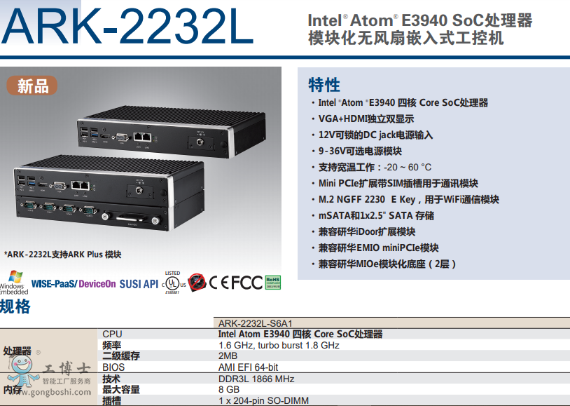 研華ARK-2232L/8G/1T/256GSSD/1130Y-0201E/無風扇嵌入式工控機 |