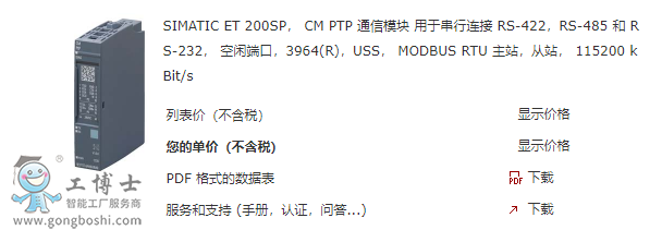 產品說明 SIMATIC ET 200SP, CM PTP 通信模塊 用于串行連接 RS-422,RS-485 和 RS-232, 空閑端口,3964(R),USS, MODBUS RTU 主站,從站, 115200 kBit/s