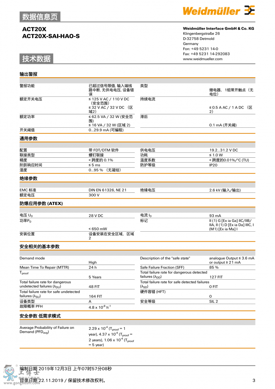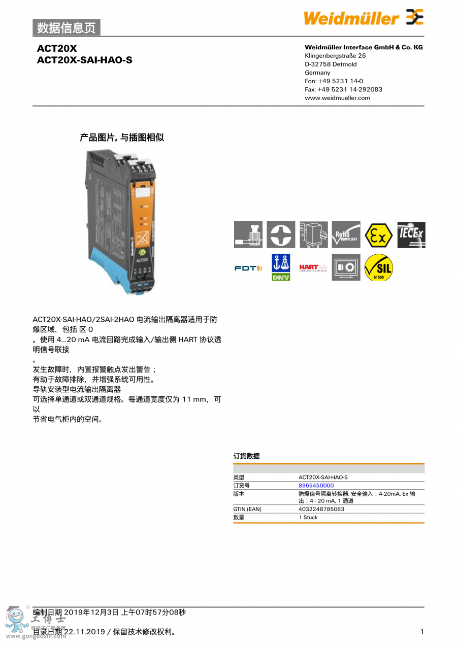 ACT20X-SAI-HAO-S 魏德米勒 防爆信號隔離轉換器 訂貨號8965450000 |