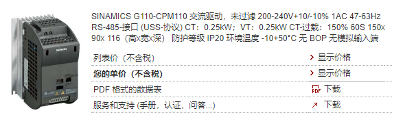 產品說明 SINAMICS G110-CPM110 交流驅動,未過濾 200-240V+10/-10% 1AC 47-63Hz RS-485-接口 (USS-協議) CT:0.25kW;VT:0.25kW CT-過載:150% 60S 150x 90x 116(高x寬x深) 防護等級 IP20 環境溫度 -10+50°C 無 BOP 無模擬輸入端