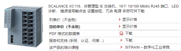 SCALANCE XC116,非管理型 IE 交換機,16個 10/100 Mbit/s RJ45 端口,LED 診斷, 錯誤信號觸點含 設置按鈕,冗余 電源 手冊可供下載 |