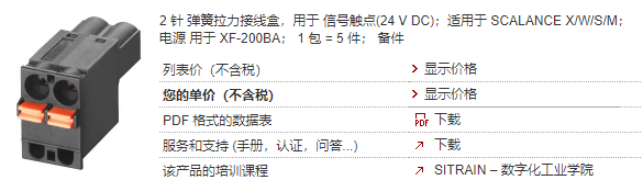 產品說明 2 針 彈簧拉力接線盒,用于 信號觸點(24 V DC);適用于 SCALANCE X/W/S/M; 電源 用于 XF-200BA; 1 包 = 5 件; 備件