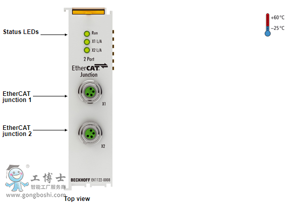 EtherCAT 分支耦合器通過 M8 接口連接,各個 LED 用來顯示鏈路和活動狀態。運行 LED 用于指示 EK1122-0008 的狀態。通過 TwinCAT 或其它適用的 EtherCAT 主站,EK1122-0008 也支持整個 EtherCAT 網段在運行期間的連接和斷開連接(熱連接)。如果以太網電纜具有足夠的性能,例如, Zk1090-3131-1xxx,通過 M8 電纜長度可以達到 100 米。