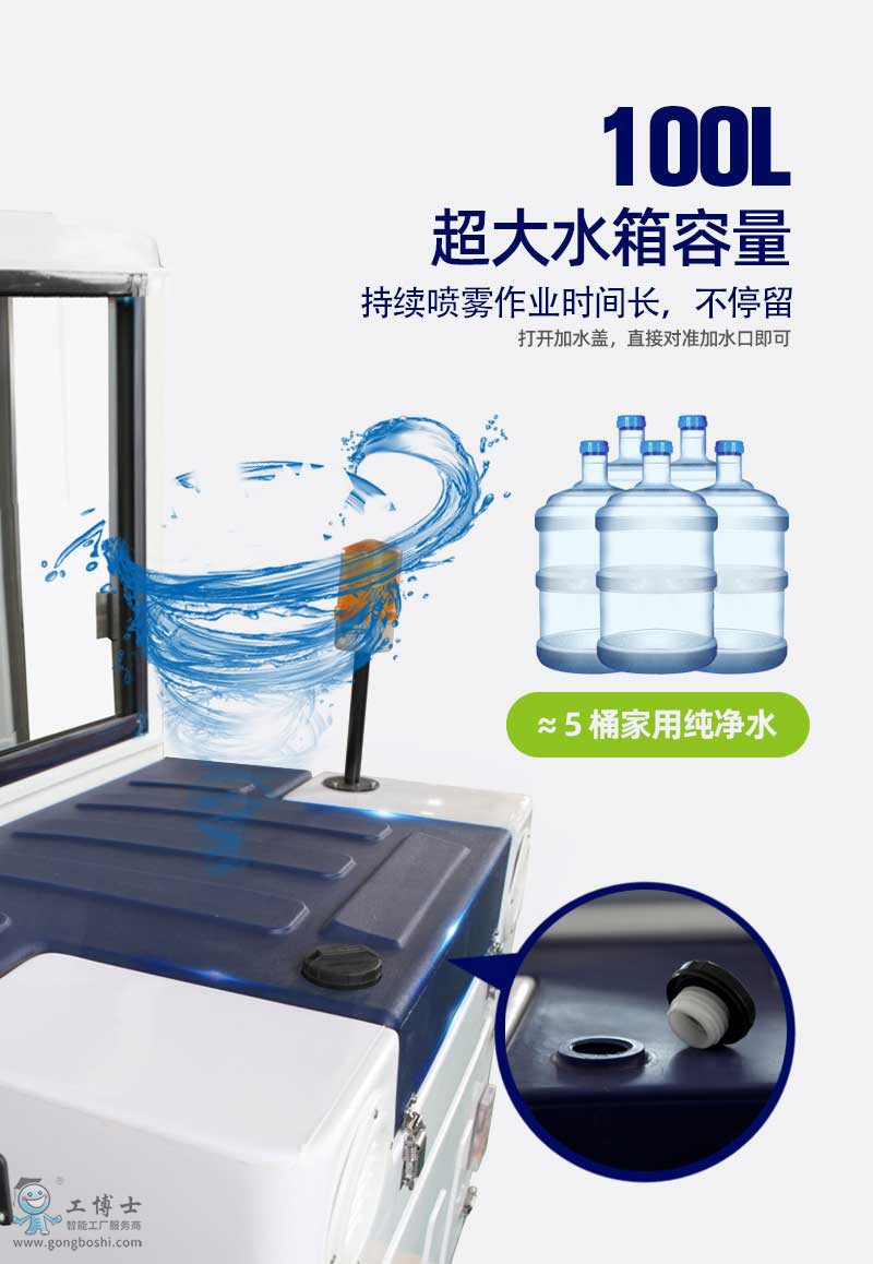 采用三輪掃地車超大過濾系統(tǒng),過濾面積大,吸塵能力強;水箱容量大,噴霧時間長。