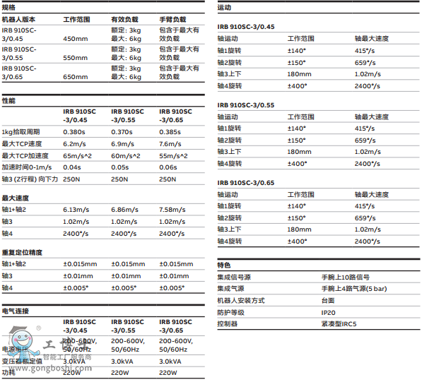 ABB Scara生產線的IRB 910SC被設計成在一個有限的空間內工作,適合于小部件的組裝、材料處理和檢查部件。它帶有一個6公斤的*大載荷,IRB 910 sc可用三種配置(IRB 910 sc -3/0.45 IRB 910 sc - 3/0.55 M, IRB 910 sc - 3 / 0.65)都是模塊化設計,適合客戶需要更快的周期時間,高精度和高可靠性的應用程序。