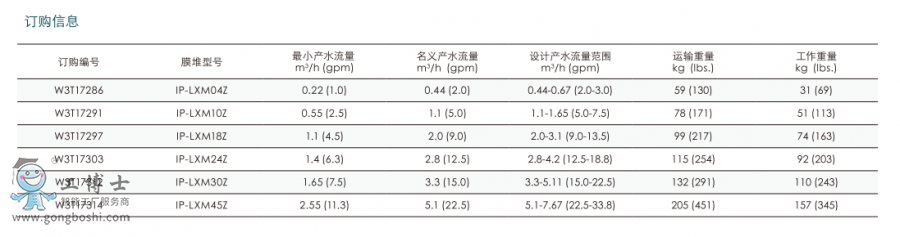 膜堆型號 設計產水流量 *低允許產水流量 DC電壓* DC電流 運輸重量 工作重量