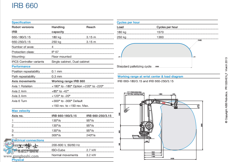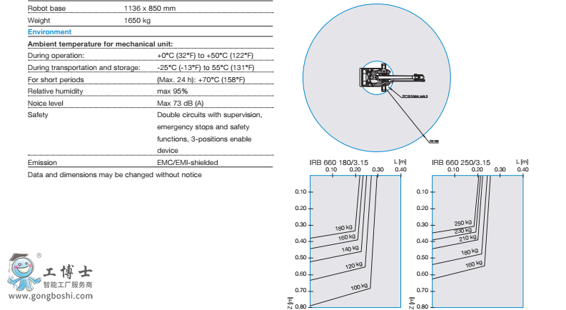 高速版IRB 660機器人全速時有效載荷可達180kg,而高產量250kg版機器人的到達距離*長可達3.15m。