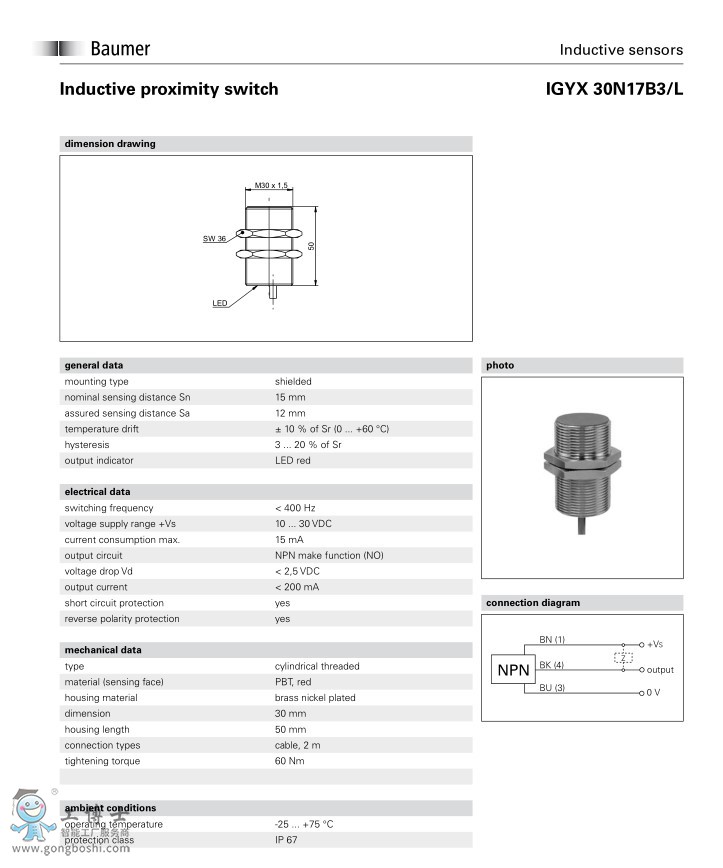Baumer 堡盟 IGYX 30N17B3/L電感式接近開關傳感器 |