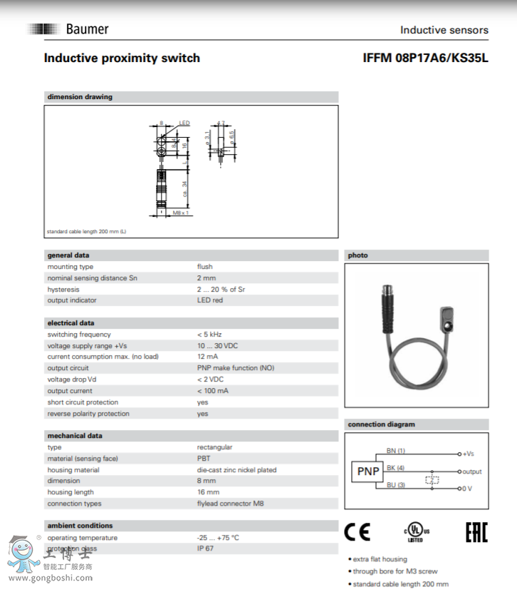 Baumer 堡盟 IFFM 08P17A6/KS35L-電感式接近開關傳感器現貨可開增票 |