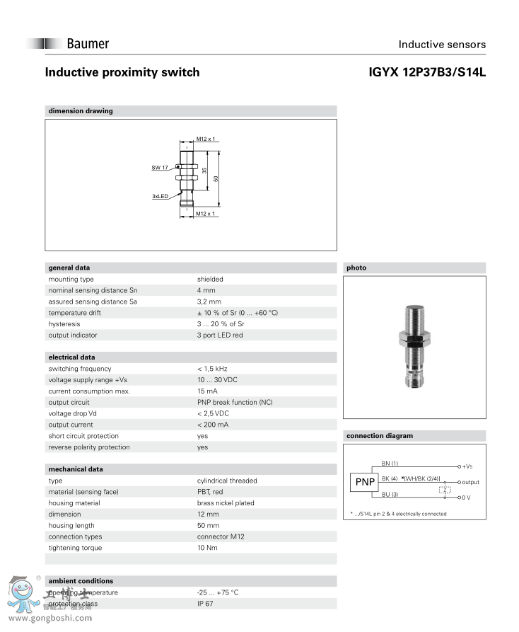 Baumer 堡盟 IGYX 12P37B3/S14L電感式接近開關傳感器現(xiàn)貨開增票 |