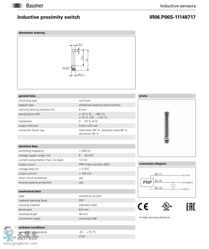 Baumer 堡盟 IR06.P06S-N46.PO1Z.7SL -電感式接近開關(guān) 可開增票 |