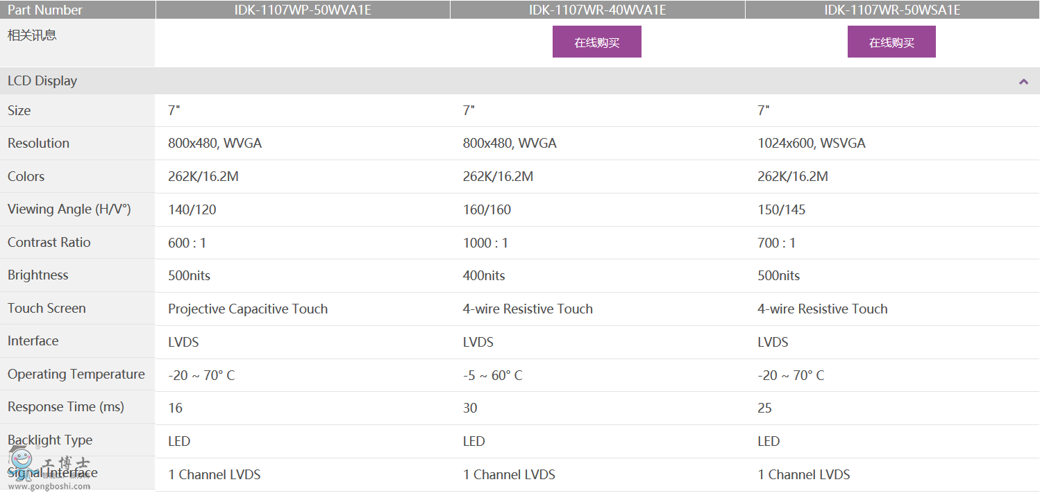 7° LCD 支持 800 x 480 × 1024 x 600 像素和寬工作溫度 (-20° 70°C) |