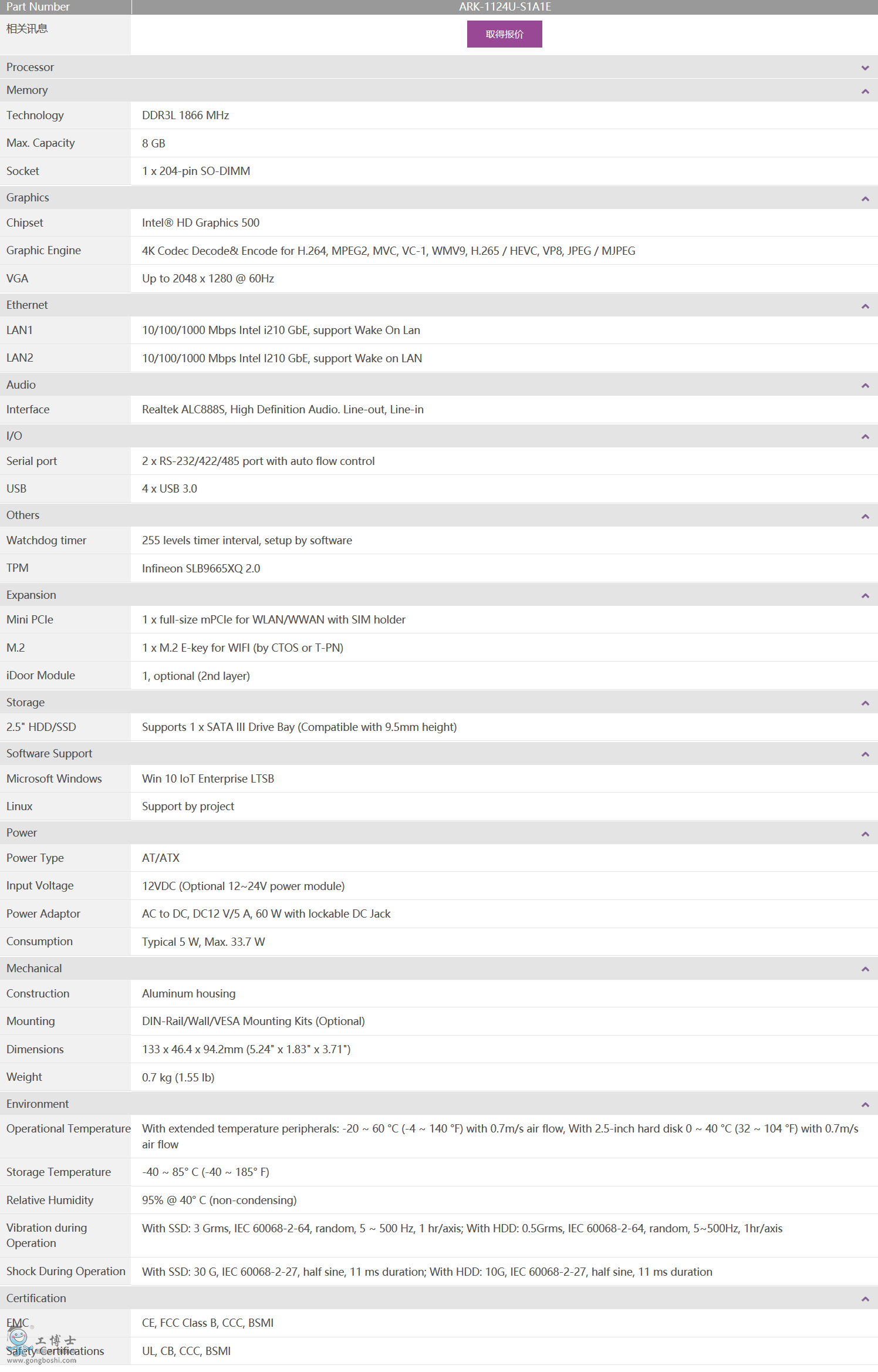 支持: 支持VGA顯示/ 2x RS-232/422/485 / 4x USB 3.0