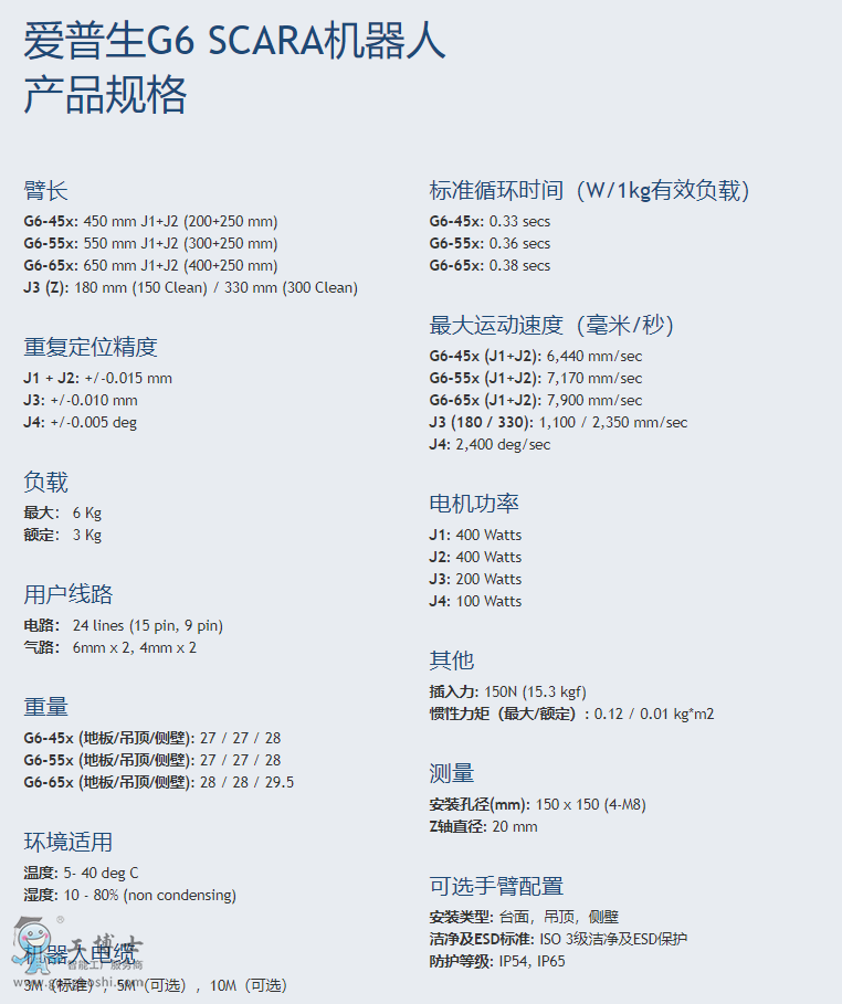 愛普生G6 SCARA機器人非常適合需要高速度和/或高精度的應用,如機械或電氣裝配,取放,打包備料,配藥等。隨著應用運行于要求苛刻的行業,如汽車,醫療,半導體,食品,制藥,硬盤驅動器,消費者等,愛普生G6 SCARA機器人成為理想選擇。G6 SCARA手臂提供450,550和650毫米臂長,可帶180(150潔凈型)或330(300潔凈型)Z軸長度。 它們還可提供臺面、側壁或吊頂等安裝方式。潔凈/ESD和沖洗型號也提供這3種主要臂長。 這樣就有很多選擇,確保您的下一個應用有合適的機器人。