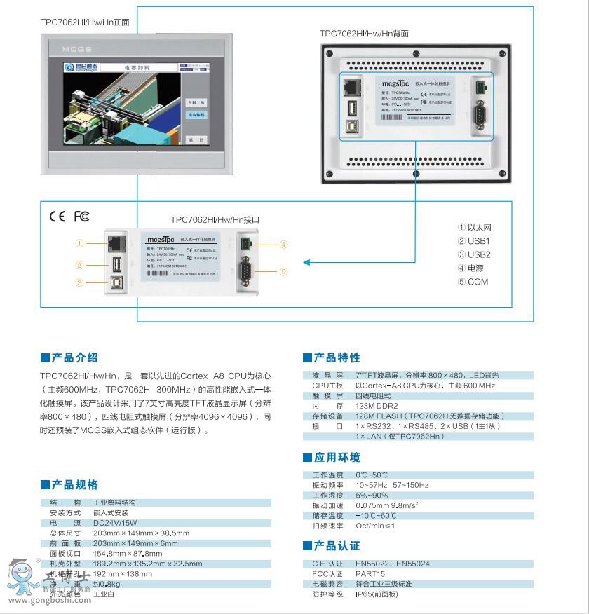 TPC7062Hl,是一套以先進的Cortex-A8 CPU為核心(主頻300MHz)的高性能嵌入式一體化觸摸屏。該產品設計采用了7英寸高亮度TFT液晶顯示屏(分辨率800×480),四線電阻式觸摸屏(分辨率4096×4096)。同時還預裝了MCGS嵌入式組態軟件(運行版),具備強大的圖像顯示和數據處理功能。