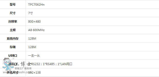 TPC7062Hn,是一套以先進的Cortex-A8 CPU為核心(主頻600MHz)的高性能嵌入式一體化觸摸屏。該產品設計采用了7英寸高亮度TFT液晶顯示屏(分辨率800×480),四線電阻式觸摸屏(分辨率4096×4096)。同時還預裝了MCGS嵌入式組態軟件(運行版),具備強大的圖像顯示和數據處理功能。