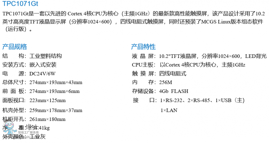 TPC1071Gt,是采用 4核(主頻1GHz)CPU為核心的超高性能嵌入式一體化觸摸屏。該產品設計采用了10.2英寸高亮度TFT液晶顯示屏(分辨率1024×600),四線電阻式觸摸屏,以及具有良好的電磁屏蔽性。同時還預裝了MCGS嵌入式組態軟件(運行版),具備強大的圖像顯示和數據處理功能。