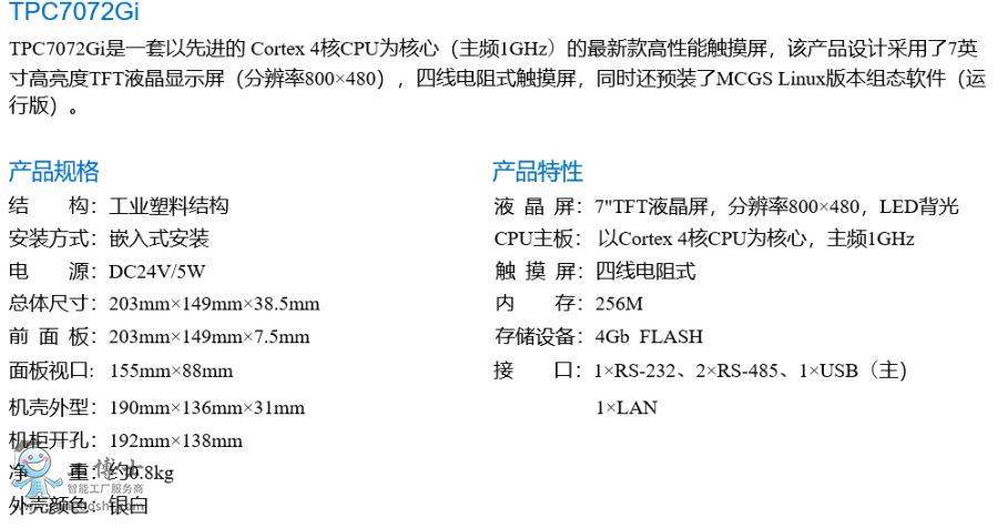 TPC7072Gi,是采用 4核(主頻1GHz)CPU為核心的超高性能嵌入式一體化觸摸屏。該產(chǎn)品設(shè)計采用了7英寸高亮度TFT液晶顯示屏(分辨率800×480),四線電阻式觸摸屏,以及具有良好的電磁屏蔽性。同時還預(yù)裝了MCGS嵌入式組態(tài)軟件(運(yùn)行版),具備強(qiáng)大的圖像顯示和數(shù)據(jù)處理功能。
