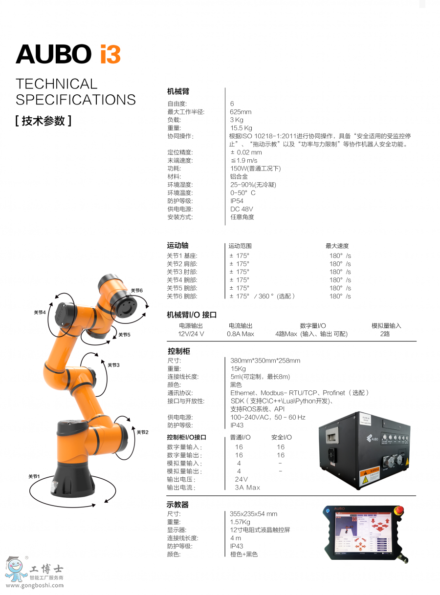 - AUBO-i3是遨博協作機器人中負載***小的型號,末端負載為3kg