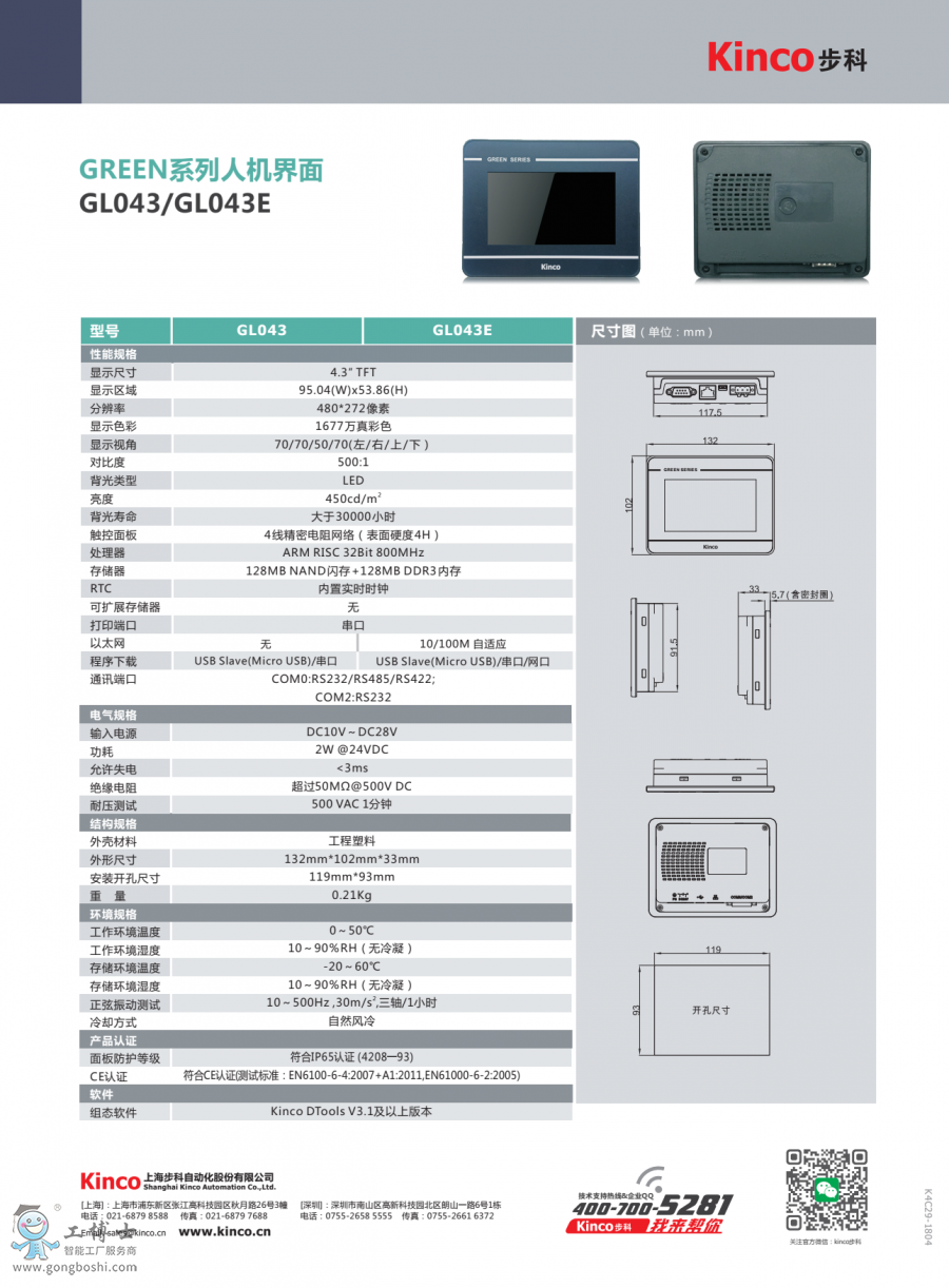 步科GREEN系列人機界面 GL043 4.3寸