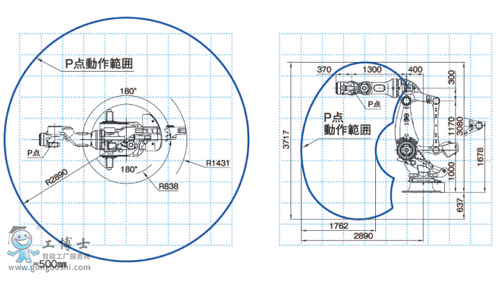 | 注)1、在電纜不通過第6軸的中空部位時,根據使用條件的不同,動作范圍***大可以擴伸至±360° |