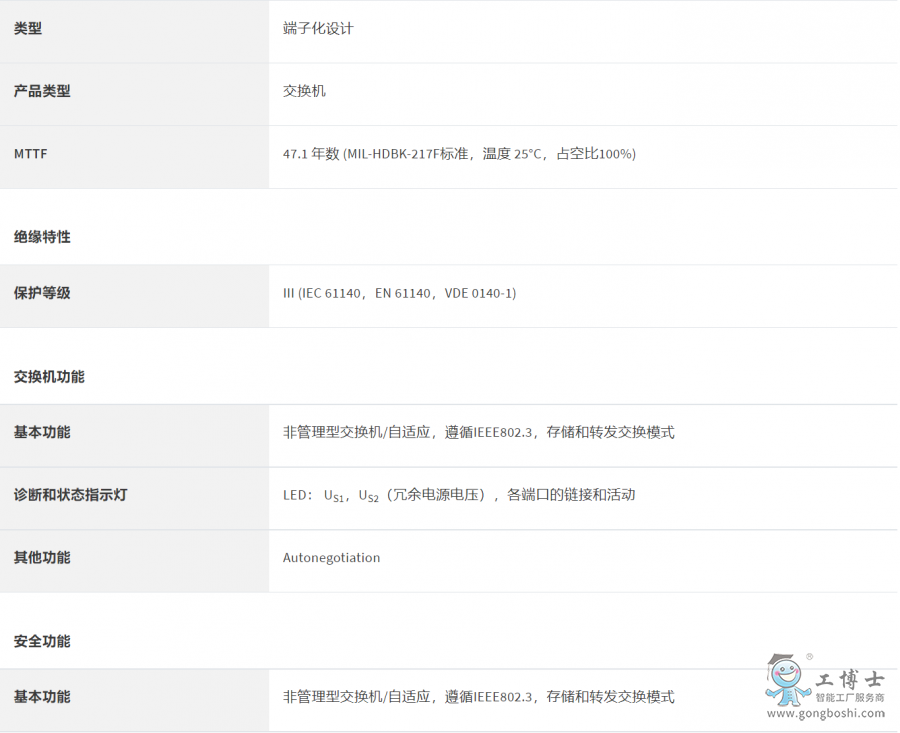 以太網交換機,6個TP RJ45端口,2個FO端口,100 Mbit/s全雙工,SC-D格式,10或100 Mbit/s(RJ45)數據傳輸速率自動檢測,自動交叉。