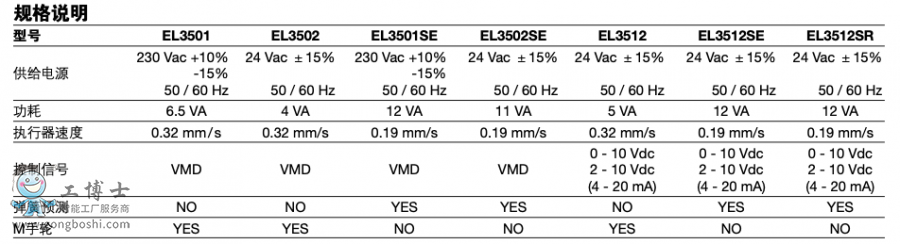 EL3500系列執(zhí)行器可供型號(hào)如下所述: 帶有預(yù)制彈簧的執(zhí)行器在基本型號(hào)后加SR或SE,例如EL3501SE。