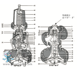 該減壓閥為導(dǎo)閥型,主閥為單閥座,硬質(zhì)合金閥芯處理, 閥本體為球墨鑄鐵(或鑄鋼),導(dǎo)閥通過螺栓直接安裝在主 閥上,閥在無負(fù)荷時(shí)能關(guān)閉。