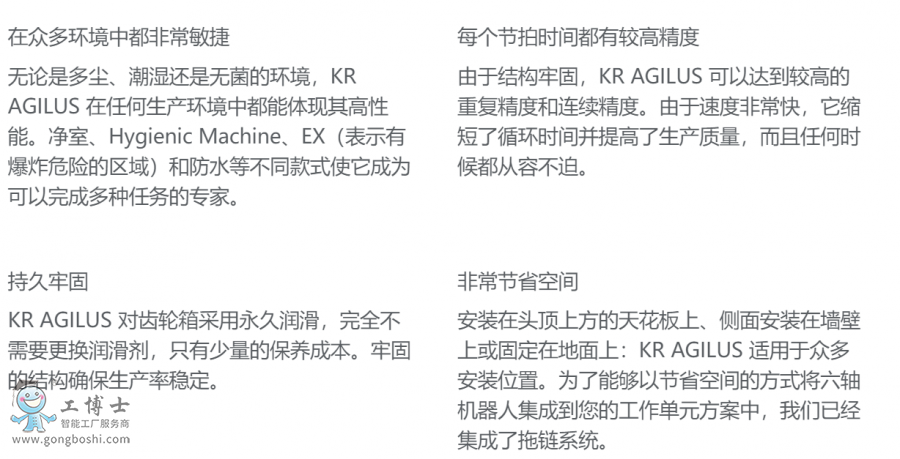 具有應用廣泛的優點,可用于新型的使用范圍。無論是地面、天花板或墻壁,由于使用內置的拖鏈系統和可靠的 KR C4 compact 控制系統,因此它可以在狹小空間內實現較高的精度。新型的自動化方案可以用來實現 Safe-Robot 功能。無論是適用于凈室、用于有爆炸危險的區域、采用符合衛生標準的設計還是防濺水:我們的各款 KR AGILUS 都可以***和快速地工作。
