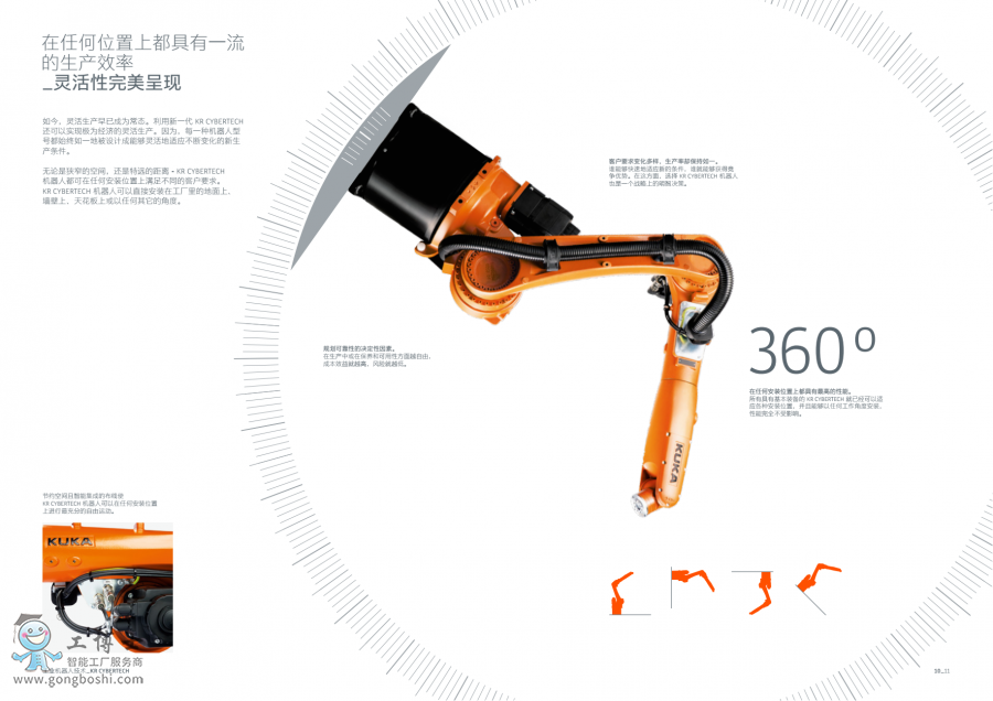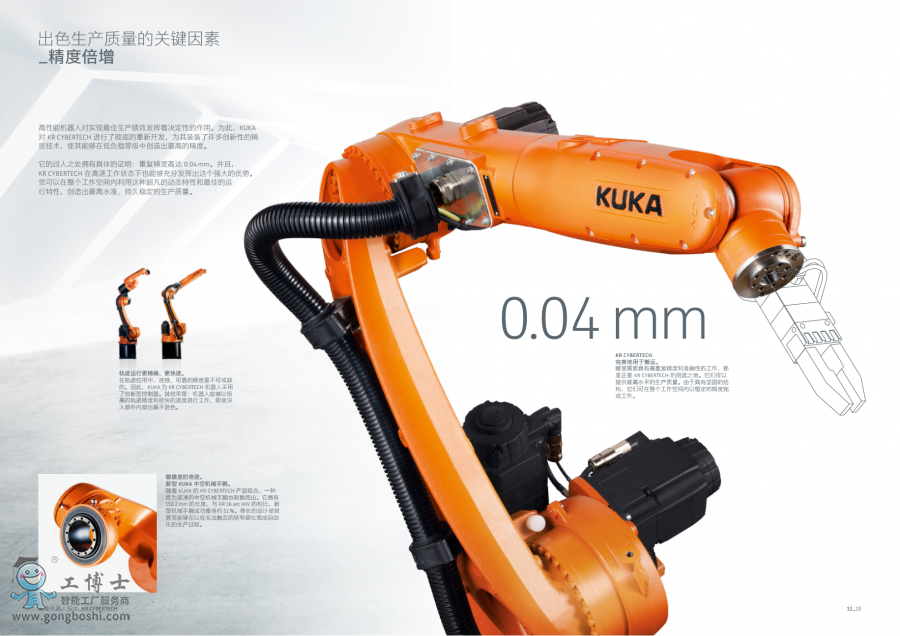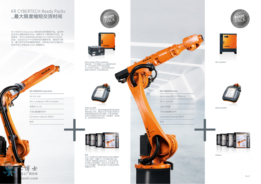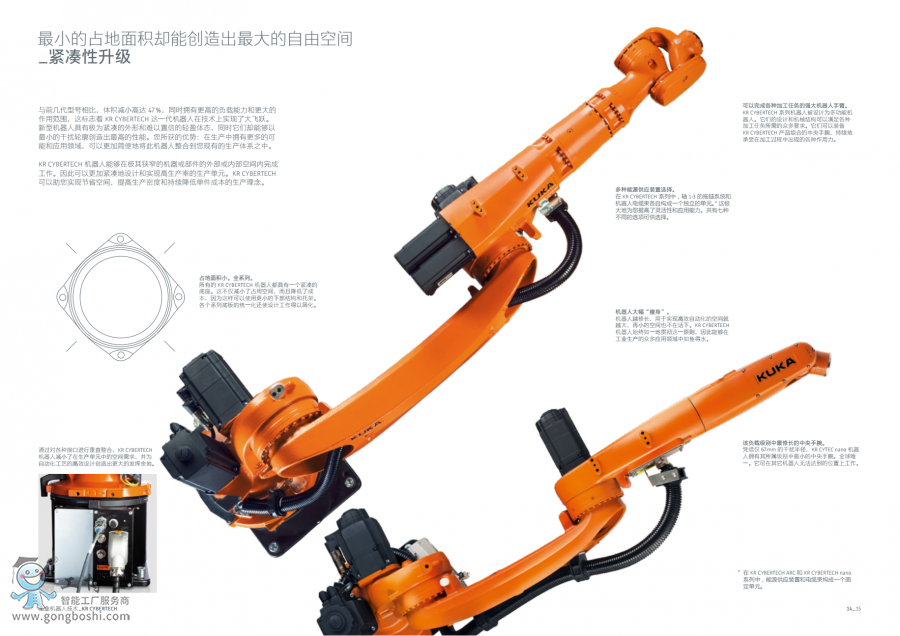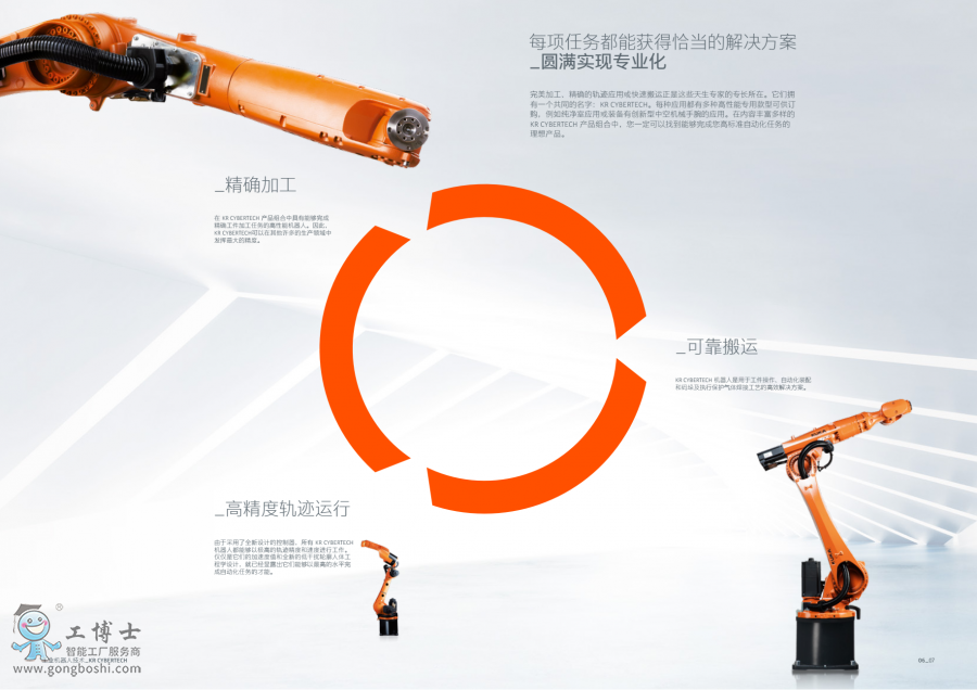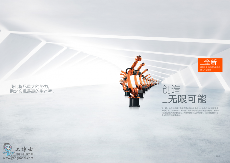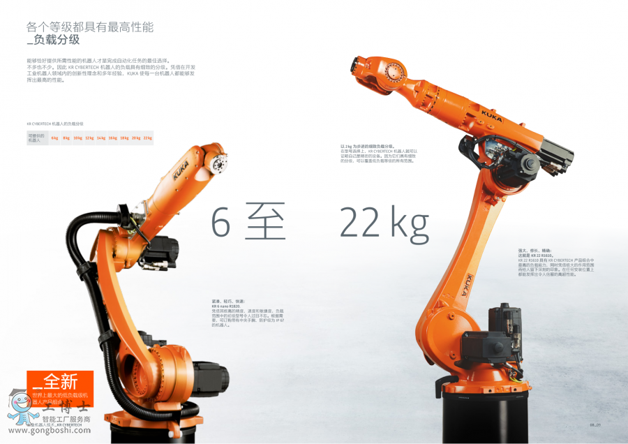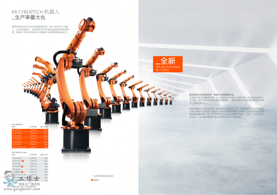 在低負載等級中,KR CYBERTECH 系列工業機器人能夠提供世界范圍內齊全、擁有高功率密度的產品系列。該系列與節省空間的單元精簡設計理念完美契合,在確保性能的同時可以大程度地降低后續成本。 低負荷機器人 KR CYBERTECH 系列下的高性能多功能機器人專門用于搬運應用:搬運大型工件、加工、裝配、碼垛和保護氣體焊接。可通過 KR C4 oder KR C4 extended 對機器人進行控制。 更多關于庫卡機器人資料請咨詢:http://kuka-palletizer.gongboshi.com/