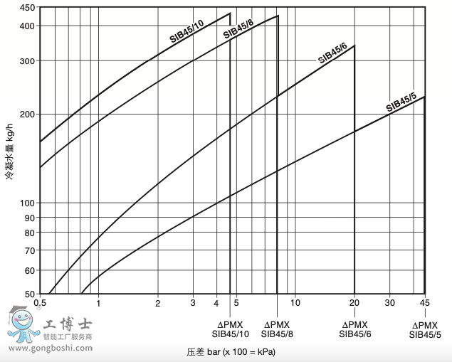 注:疏水閥的選型應根據***匹配的工作壓差而不是基于負荷,如80kg/h 7 bar壓差應采用SIB 45/8而不是SIB 45/5。