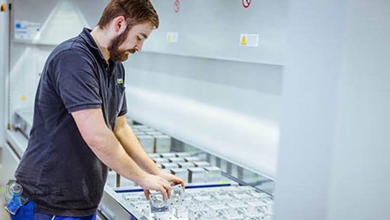 原材料進,工件成品出:ZIMM 的員工在升降系統內裝夾托盤。