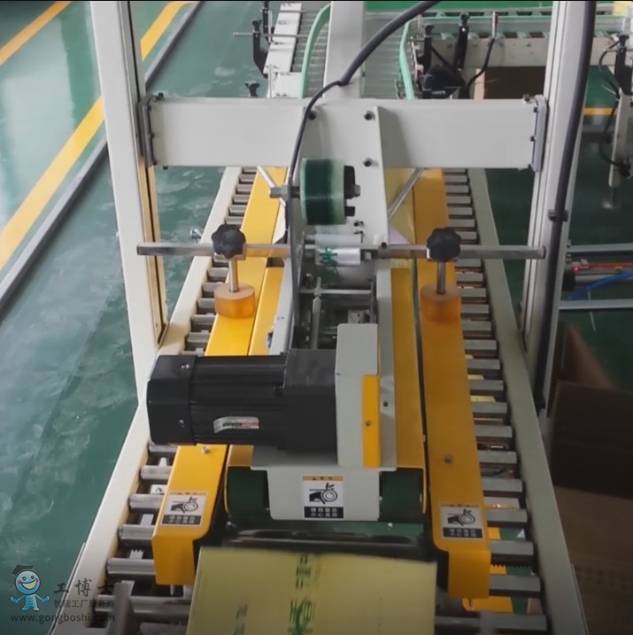 傳送帶將放入食品袋的紙箱運(yùn)輸?shù)酱虬鼨C(jī)上,讓打包機(jī)對(duì)紙箱進(jìn)行打包
