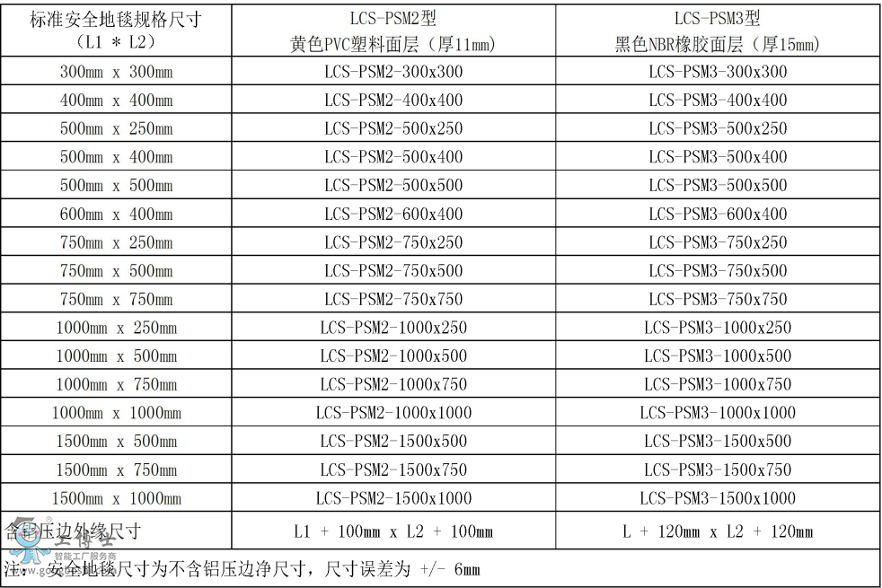 公司目前主要地毯類型為PLCS-PSM2和LCS-PSM3型安全地毯,共有17種標準尺寸。LCS-PSM2型地毯采用的是PVC防滑面層封裝,適合工廠工況使用。LCS-PSM3型地毯采用的NBR橡膠防滑層整體封裝,適合重型工況,抗砸抗叉車碾壓。經試驗認證,使用次數均超過300萬次,同時滿足IP65的防水防塵要求,可以說滿足絕大部分客戶的使用需求。使用時僅需確認地面平整度后將地毯擺放到位,將配套的型材進行配合安裝后接入電氣即可使用。推薦與我公司自主產品SR/SRA系列控制器配套使用,與這種控制其配套使用的安全地毯系統符合EN1760-1、ISO13856-1、EN62061等標準。