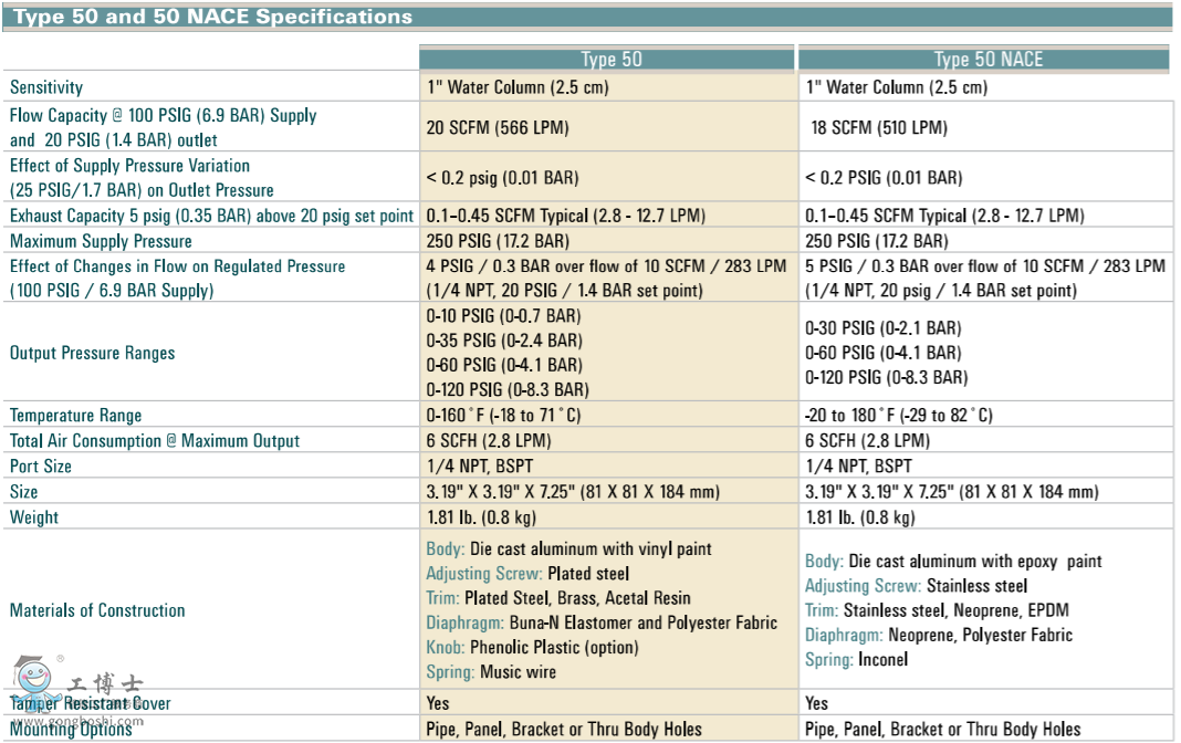 Marsh BelloframT50/ T50 NACE精密過濾減壓閥是可靠的壓力調(diào)節(jié)閥,設(shè)計(jì)用于標(biāo)準(zhǔn)(T50)和腐蝕性環(huán)境(T50 NACE)的儀器和一般用途。T50 NACE符合NACE材料要求#MR-01-75,用于油田設(shè)備的耐硫化物應(yīng)力開裂金屬材料。