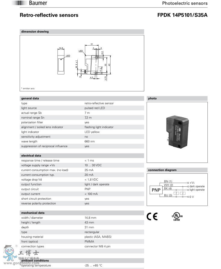 Baumer 堡盟FPDK 14N5111/S35 A鏡反射式光電傳感器 電眼,光電開關 |