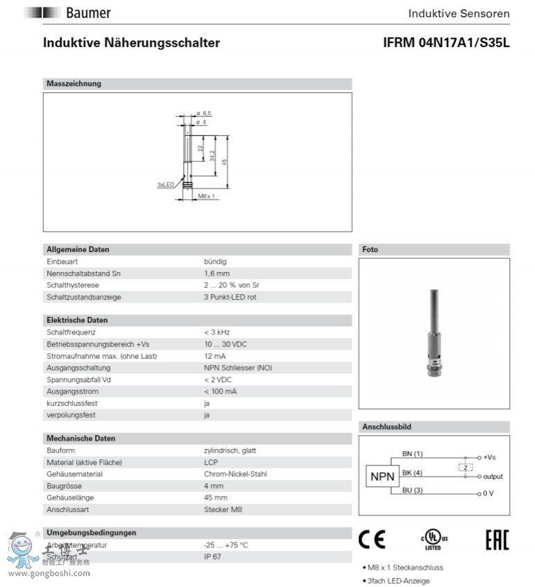 IFRM 06N1701/KS35L 引線接頭 M8 NPN 常開 (NO) 30 mm LED 紅色